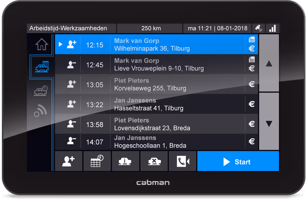 Cabman Data gir en nøyaktig fremstilling av handlingene på Cabman MDT. Blant annet kan du se nåværende kjøretøyposisjon og faktiske registrerte service- og turdata, for eksempel lastede og lossede kilometer, beløp og arbeidstid. Disse dataene er tilgjengelige med tilbakevirkende kraft i opptil 500 dager.