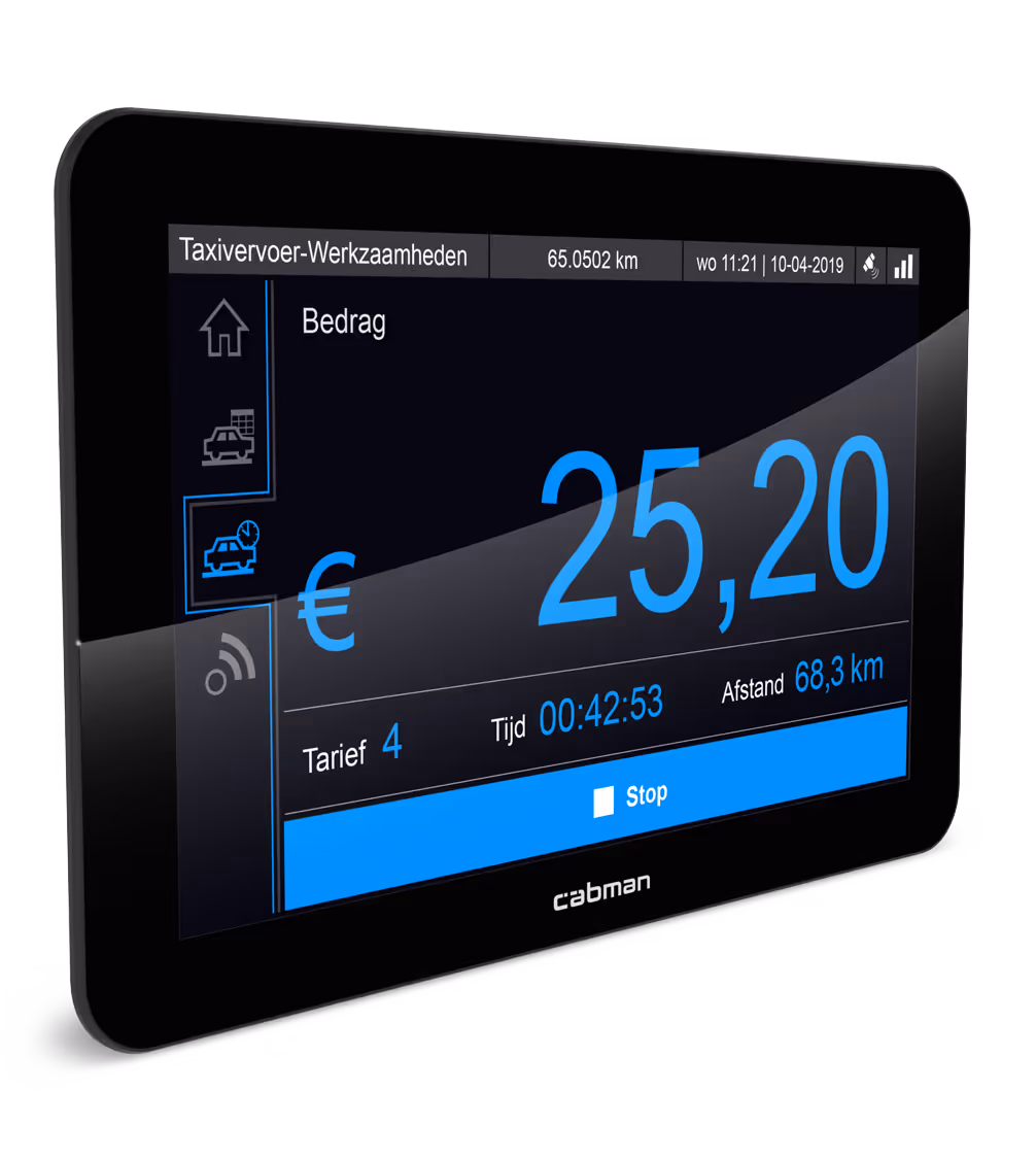 Wanneer u het Cabman Go-pakket koopt, ontvangt u de Cabman MDT, die standaard wordt geleverd met een 5-inch scherm, maar gedurende een beperkte tijd zonder extra kosten kan worden geüpgraded naar een 7-inch versie. Hierdoor profiteer je van extra schermruimte tegen een korting. Het pakket omvat ook een ingebouwde taxameter, datacommunicatie, software-updates, inzicht in reisgegevens via het online portaal van Cabman Data, een jaar garantie en een korting op de servicekosten achteraf.