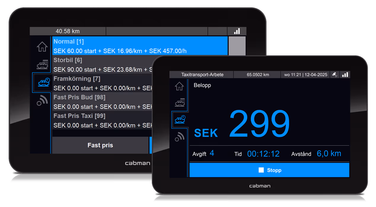 När du köper Cabman Go-paketet får du Cabman MDT, som levereras som standard med en 5-tums skärm, men kan uppgraderas till en 7-tums version utan extra kostnad under en begränsad tid. Detta gör att du kan dra nytta av extra skärmutrymme för en rabatt. Paketet innehåller också en inbyggd taxameter, datakommunikation, programuppdateringar, insikt i resedata via Cabman Data onlineportal, ett års garanti och rabatt på servicekostnader efteråt.
